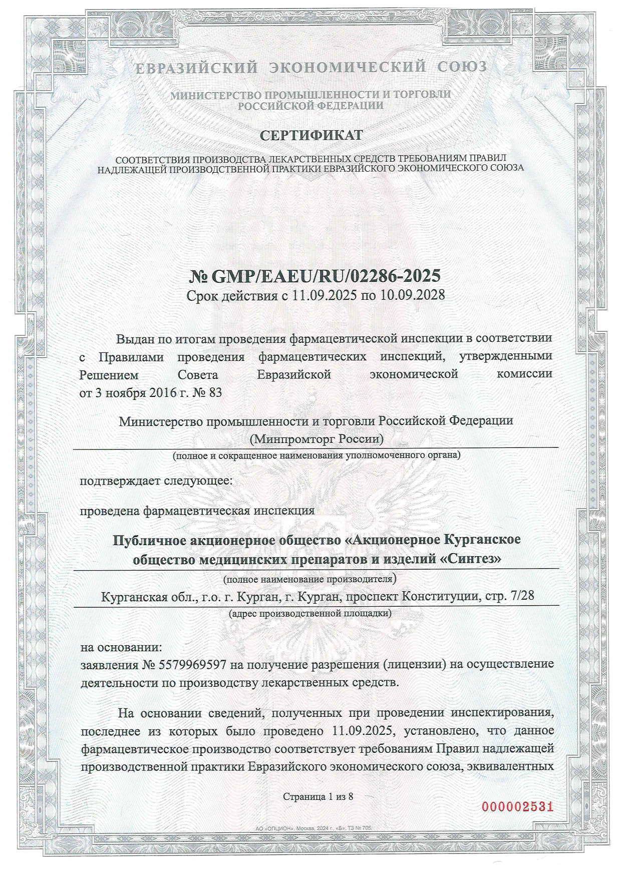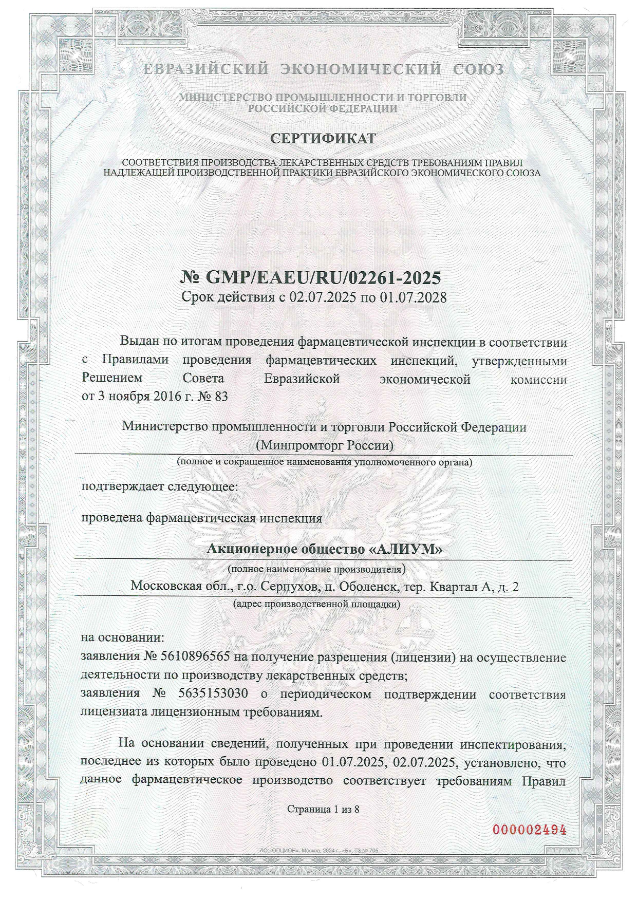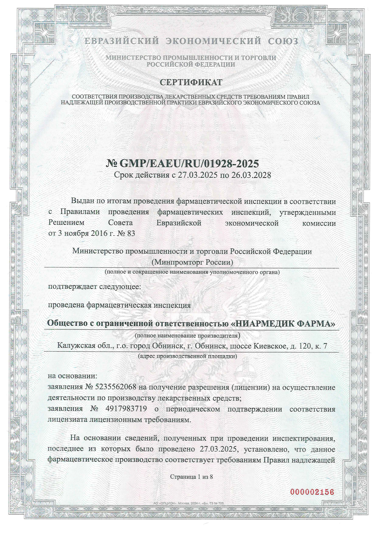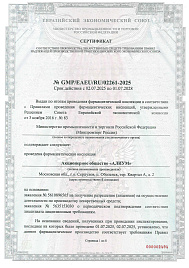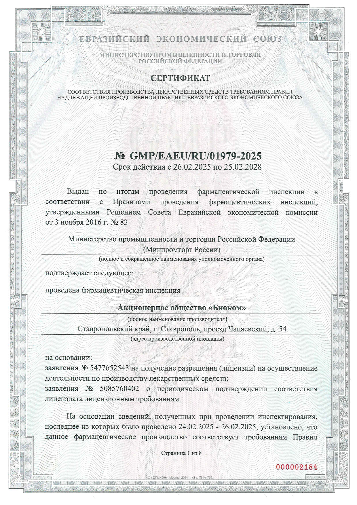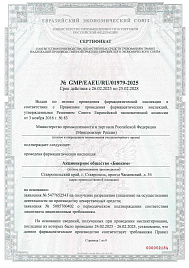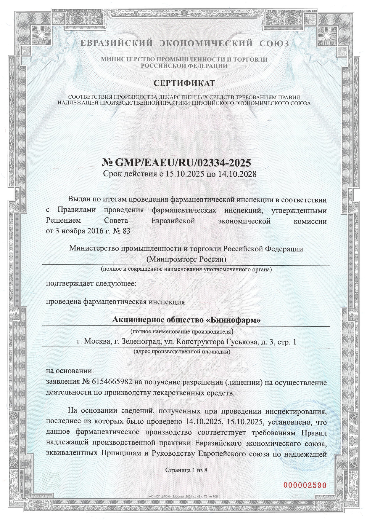 The production facilities of Binnopharm Group hold certificates of compliance with the Good Manufacturing Practice (GMP) rules for manufacturers of medicinal products for human use, issued by the Ministry of Industry and Trade of the Russian Federation.